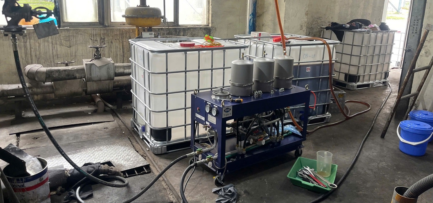Dầu tuabin được tuần hoàn từ bồn IBC qua máy lọc dầu di động Triple R