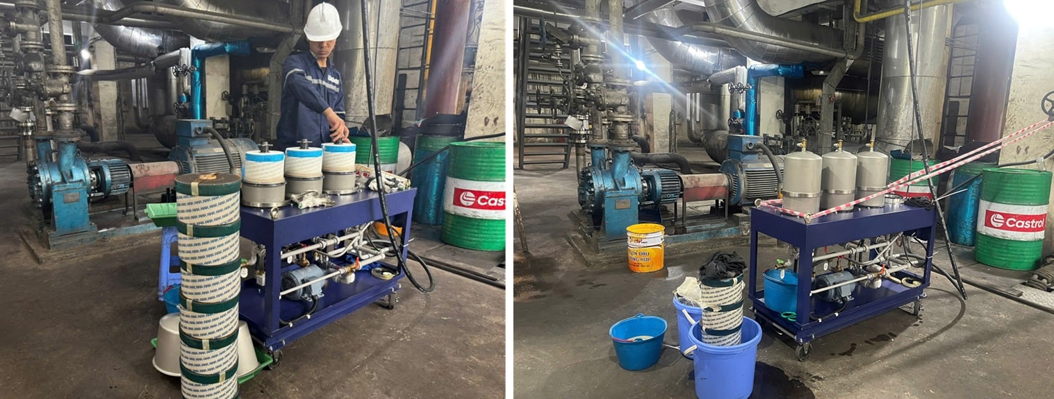 Dựa trên hình ảnh thực tế, hệ thống lọc dầu Triple R được triển khai trực tiếp tại hiện trường nhà máy: